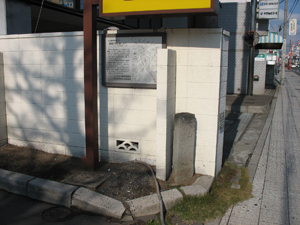 安政7年(1860)に建てられたこの石碑には「大山御嶽山 よの 引又 かわ越道」と彫られ、中山道から西へ別れる道の存在と行き方を示しています。 かつては、レストランと魚店の間に古い道があり、その道が大成町2丁目の普門院の東側へと通じ、さらに与野の町へと続いていました。